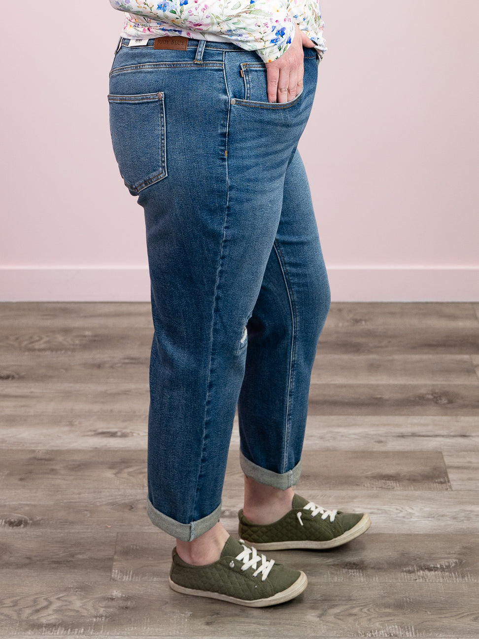 - Right knee distressing with "JUDY BLUE" stitching