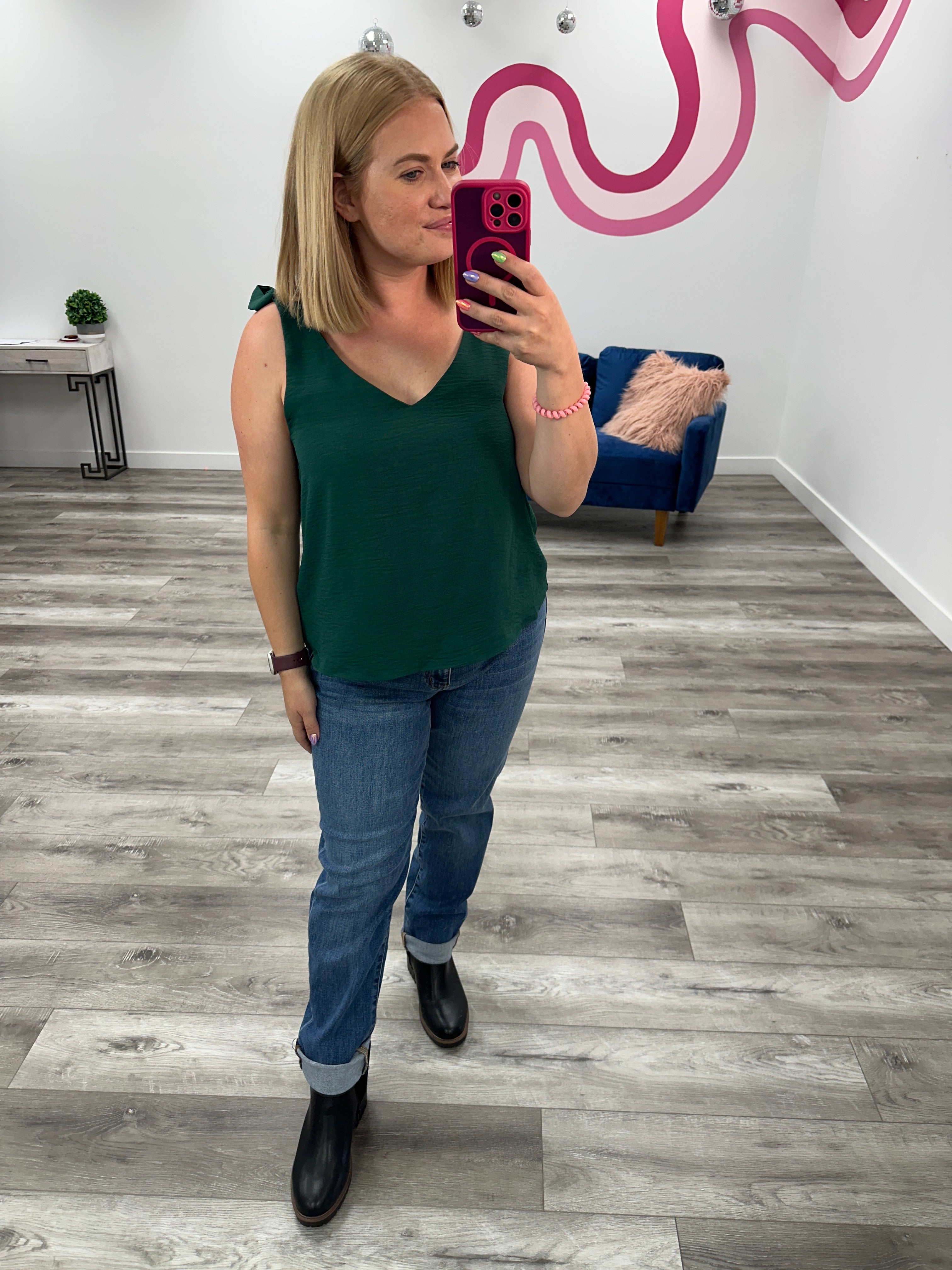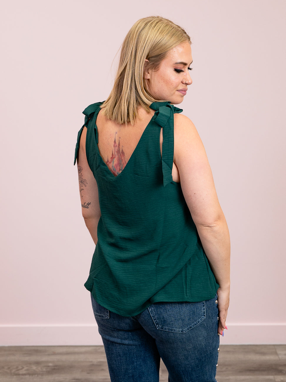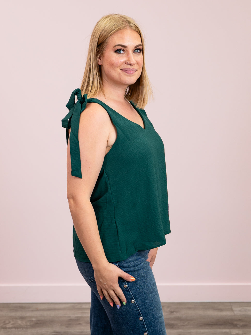 The Kendall Tie Strap Tank features a flattering V-neck and adjustable tie straps for a customizable fit. Made from lightweight material with a relaxed fit and a round hem, it’s perfect for effortless, breezy style.