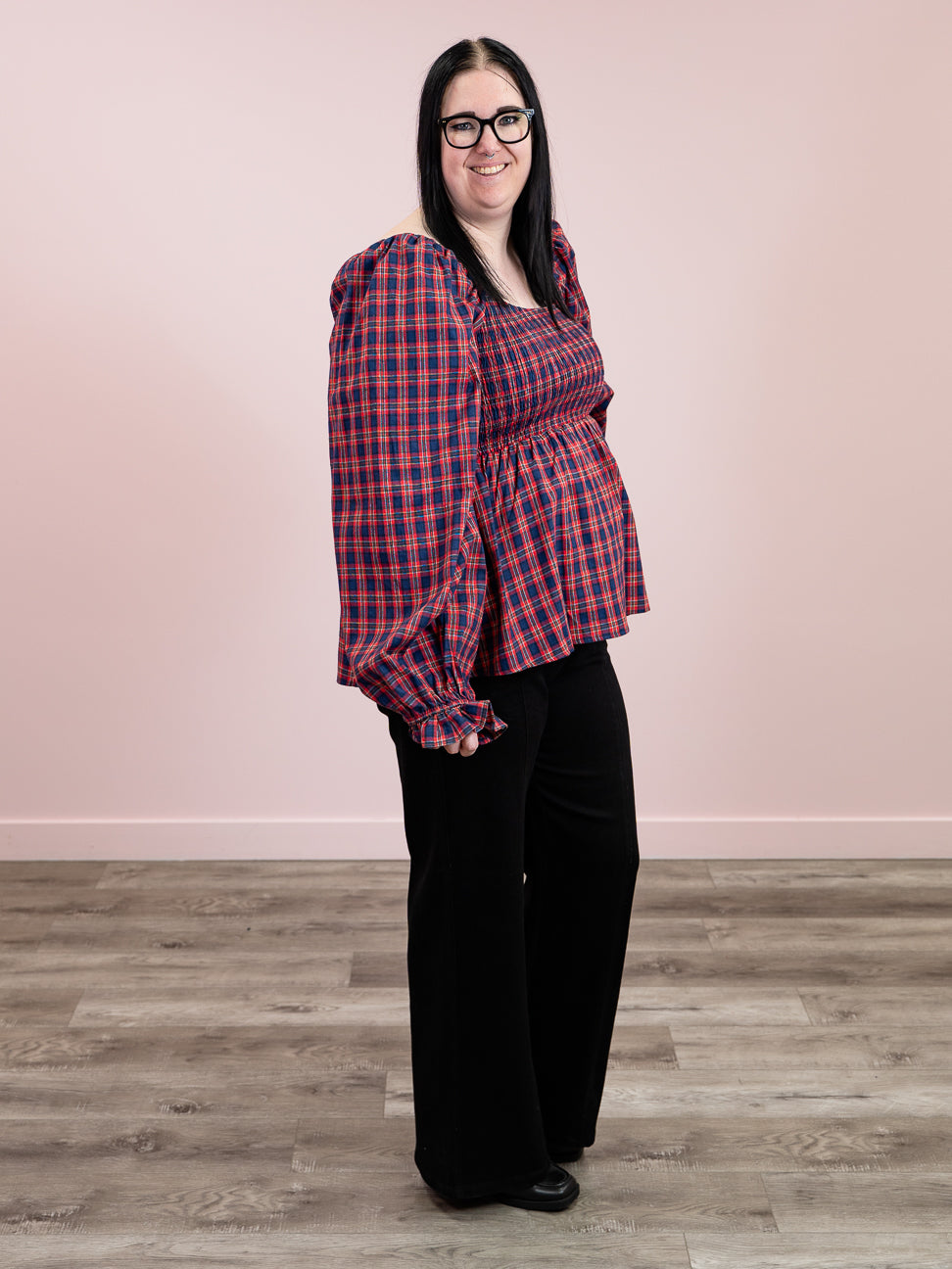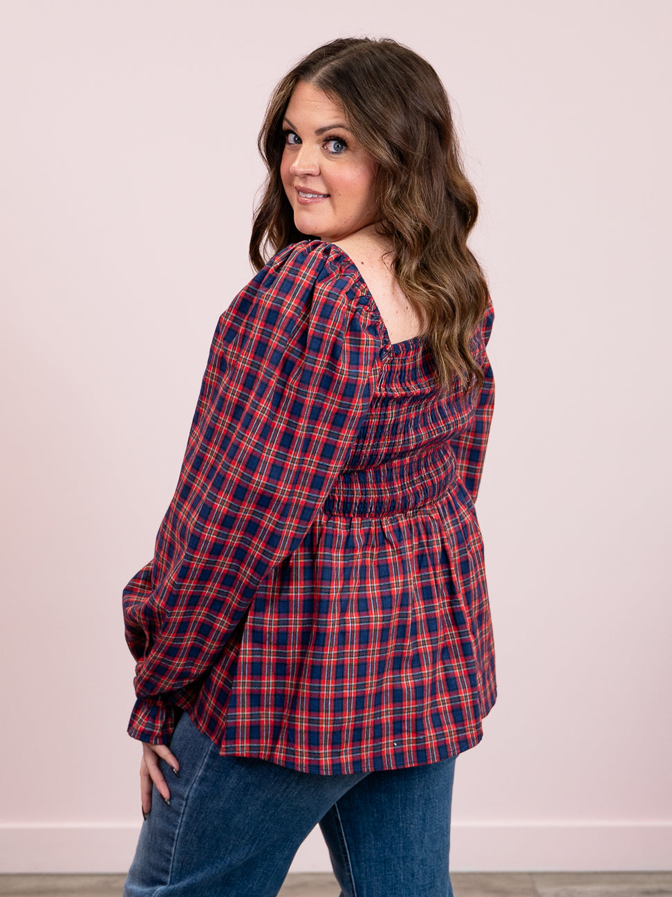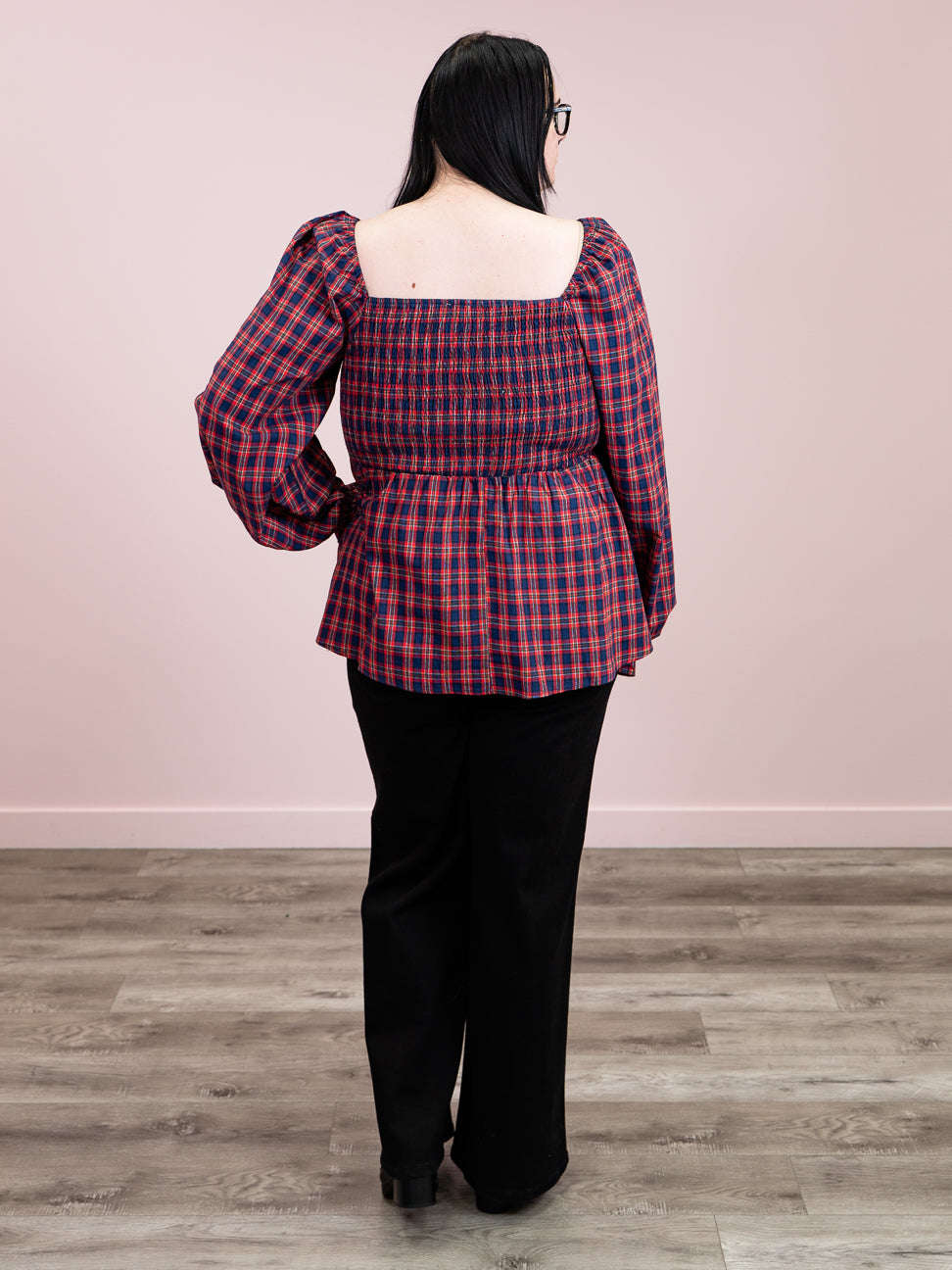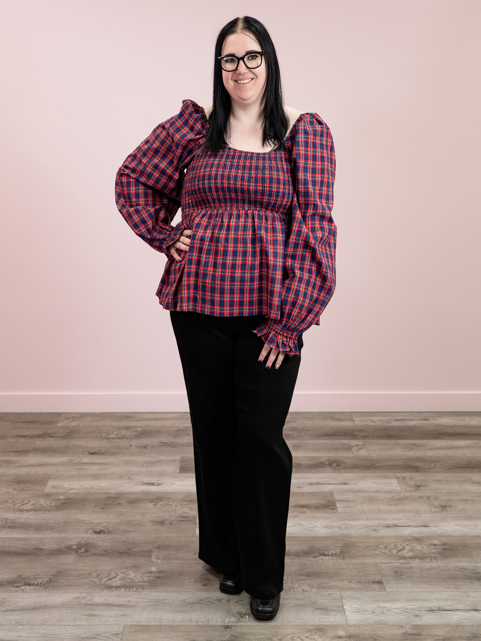 Flirty and fun, this babydoll top brings vintage charm with a modern twist. The square neckline and puffed sleeves create an adorable silhouette, while the classic red and dark blue plaid pattern adds timeless appeal. The stretchy upper body ensures a comfortable, flattering fit that moves with you. Perfect for casual outings or dressing up your everyday look with a touch of playful sophistication.