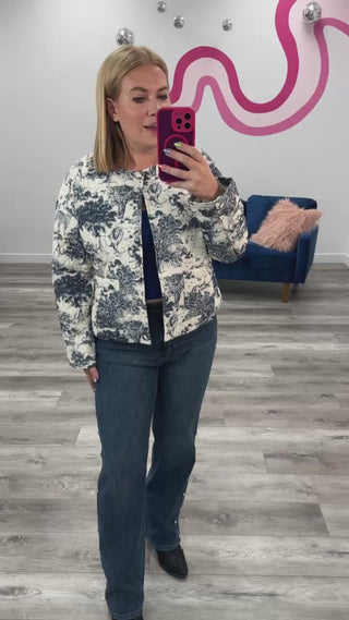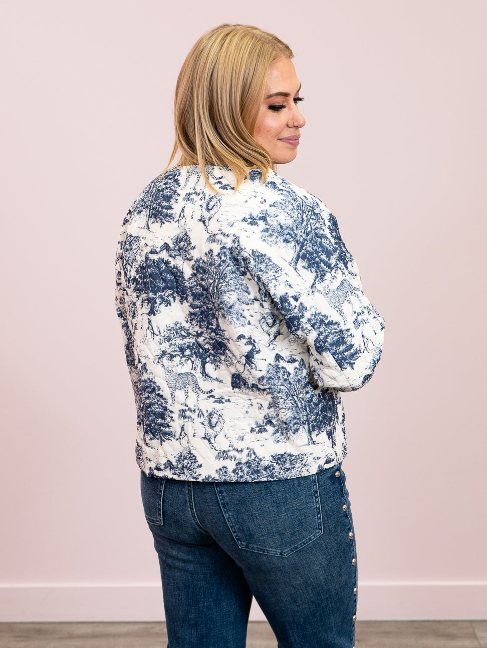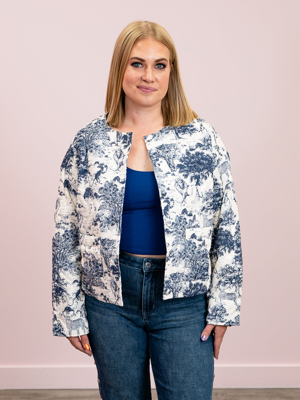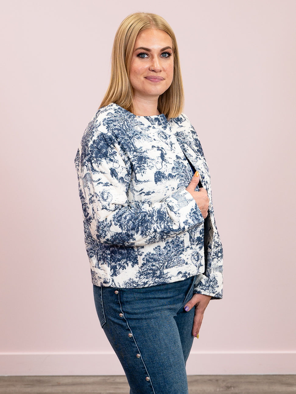 The Toulon Jacket is a quilted jacket featuring an elegant toile de Jouy print with a modern twist. Designed with wave topstitching, patch pockets, and a front button closure, this lightweight-fill jacket blends timeless charm with everyday style. Layer it over a basic top and pair with a skirt or pants for an effortlessly chic statement look.