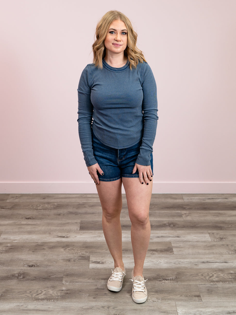 Introducing the Reanne—your new go-to for effortless cool. This mineral-washed ribbed top flaunts exposed seams and a cheeky seam detail running down the back, because who says basics have to be boring? The ribbed fabric hugs in all the right ways, while the rounded hemline keeps things soft and flattering. Throw it on with your favorite jeans and watch the compliments roll in. Dark blue never looked so good.