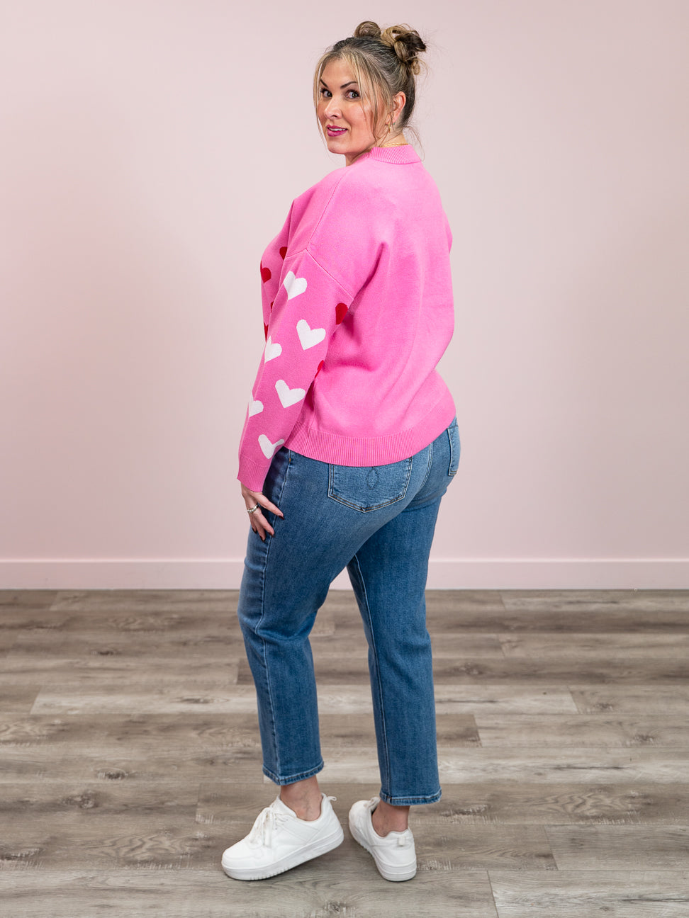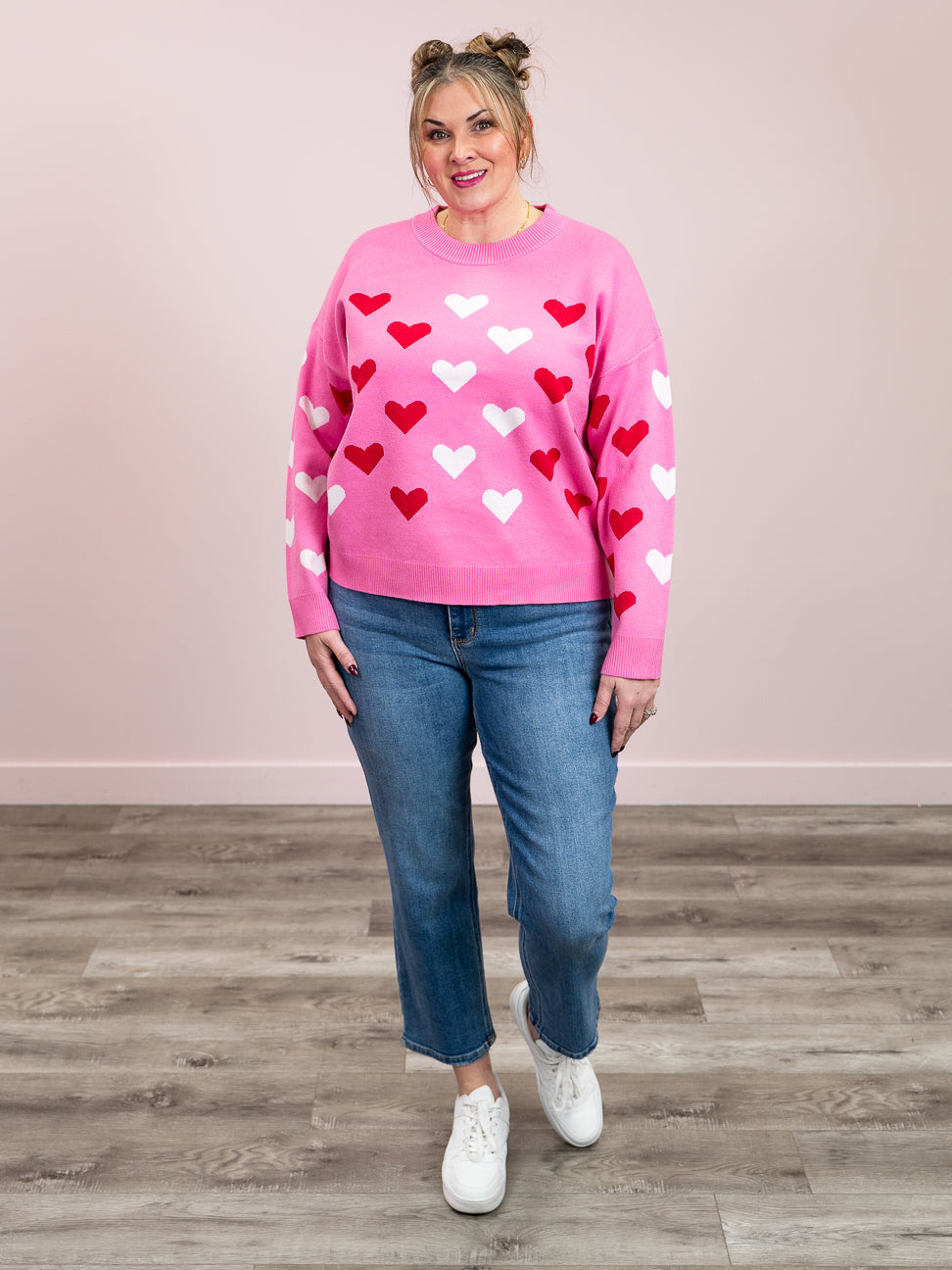 Spread the love in this charming sweater featuring adorable heart patterns across the front and sleeves. The soft, stretchy fabric moves with you all day, while ribbed details at the neckline, cuffs, and hem keep everything perfectly in place. With its relaxed drop shoulder silhouette and cozy round neckline, this piece is equal parts sweet and effortlessly cool—perfect for expressing your romantic side with a wink and a smile.