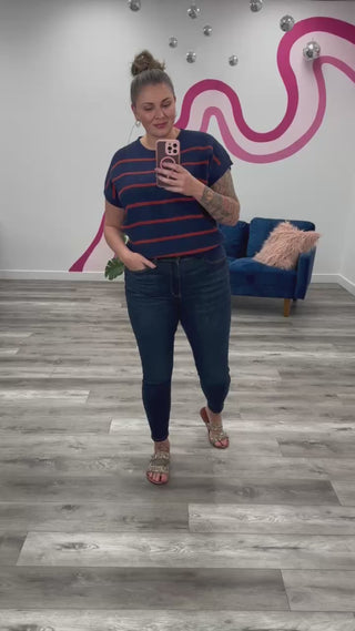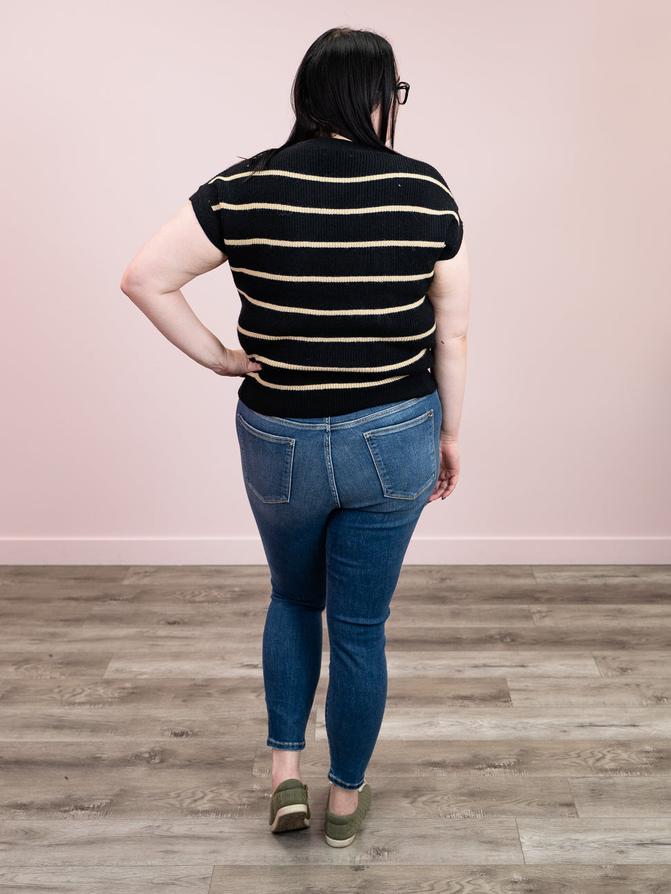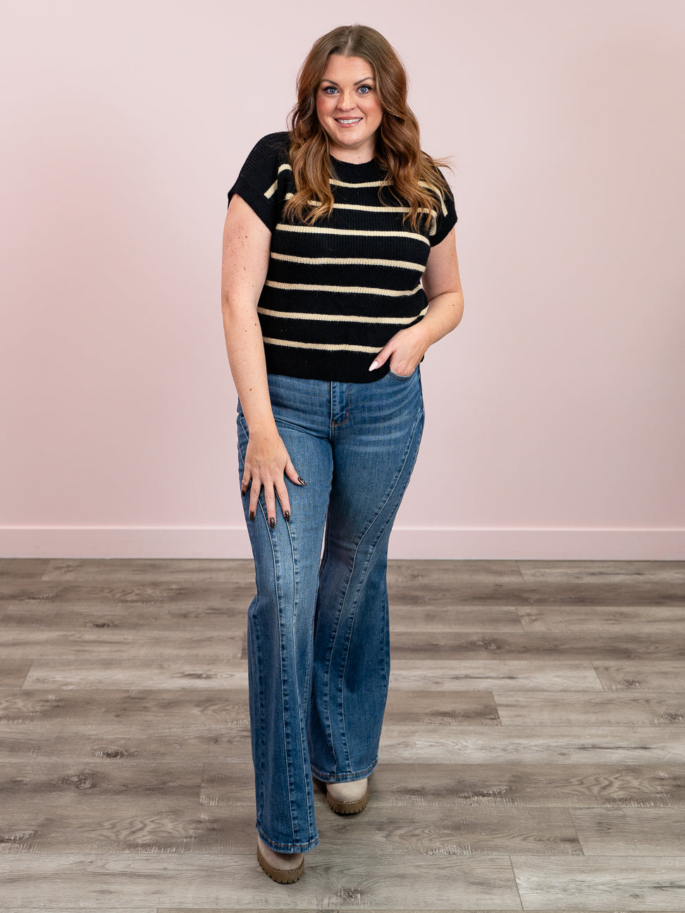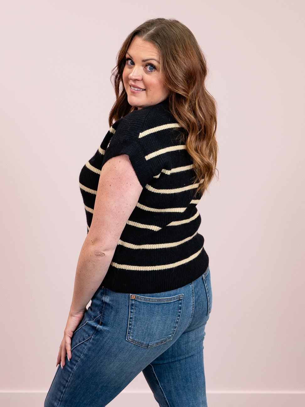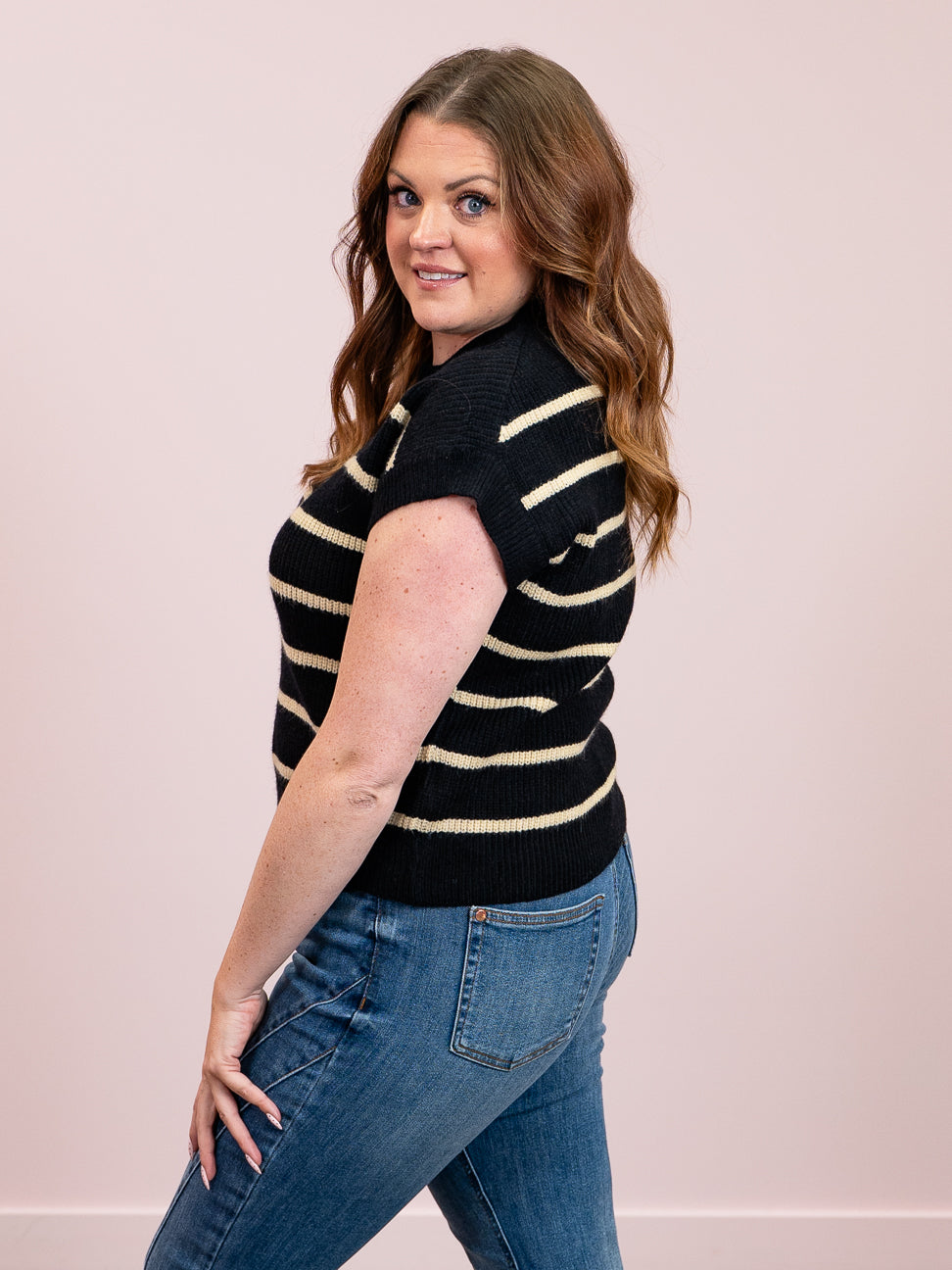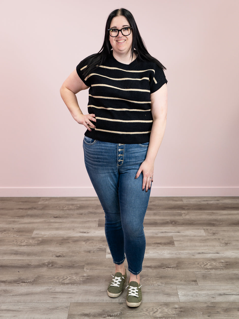 Embrace casual charm with the Sonia Striped Sweater Top. Featuring a striped design, soft and stretchy knit fabric, and a relaxed fit, this round-neck, short-sleeve sweater brings effortless comfort and style to your everyday wardrobe. Perfect for layering or wearing on its own, it promises cozy, easygoing vibes all day long.