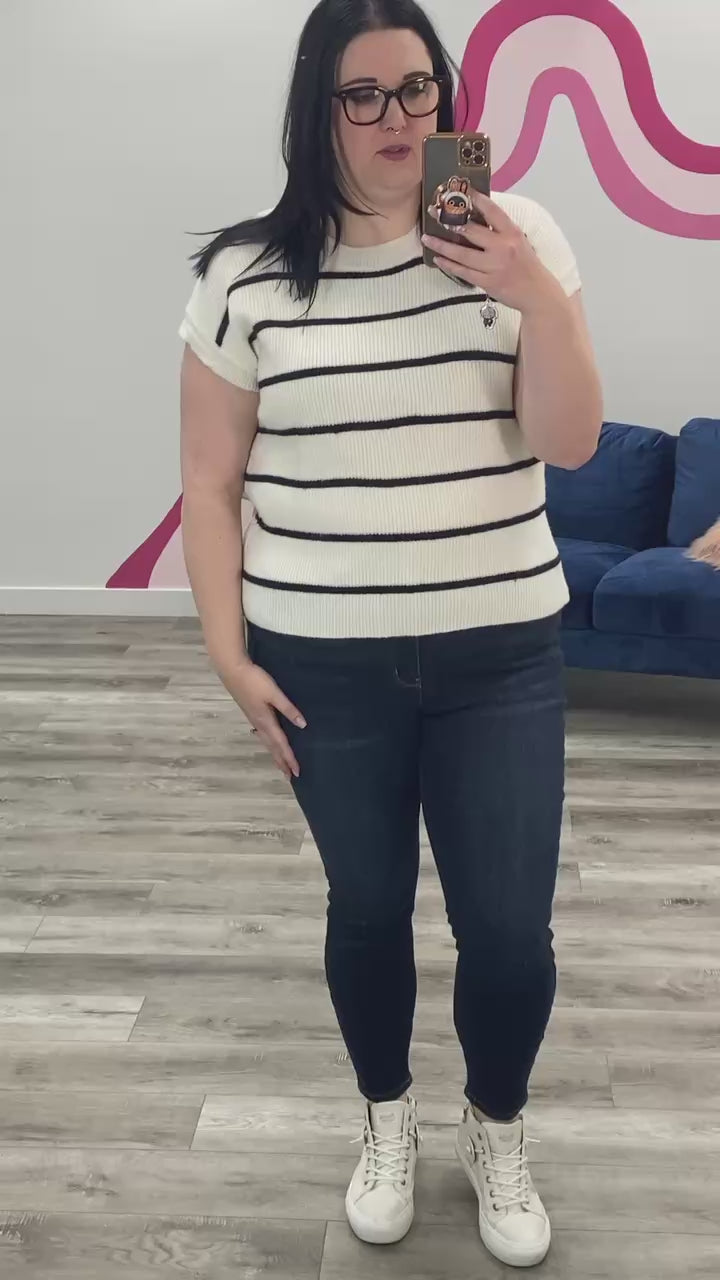 Embrace casual charm with the Sonia Striped Sweater Top. Featuring a striped design, soft and stretchy knit fabric, and a relaxed fit, this round-neck, short-sleeve sweater brings effortless comfort and style to your everyday wardrobe. Perfect for layering or wearing on its own, it promises cozy, easygoing vibes all day long.