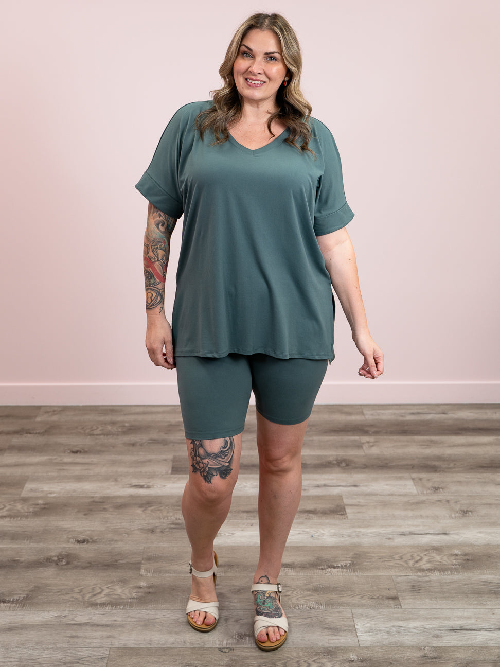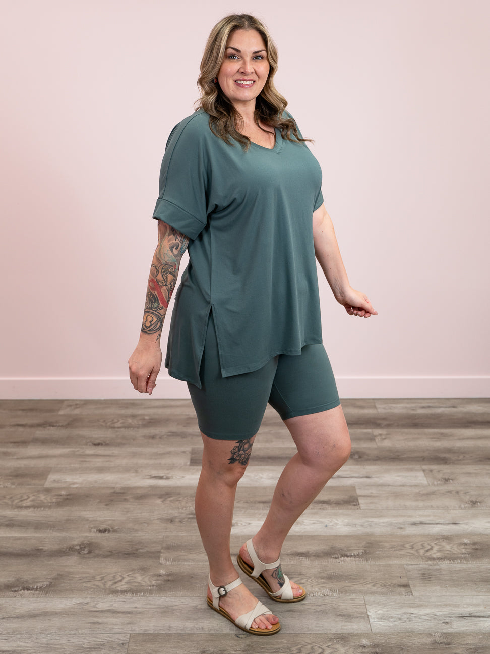 The Heidi Set is the perfect wardrobe essential! Constructed from a lightweight fabric, the set includes a tee with a V-neck, cuffed short sleeves and a hi-low hem with side slits. The shorts are high rise with an elastic waist and biker short design. These sets are so buttery soft, you'll want to live in them!