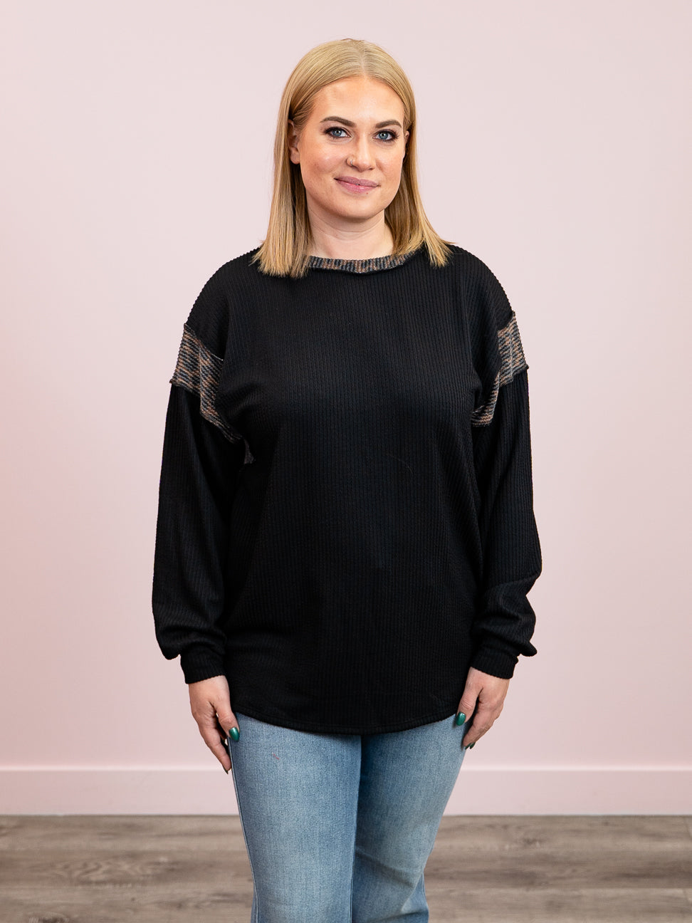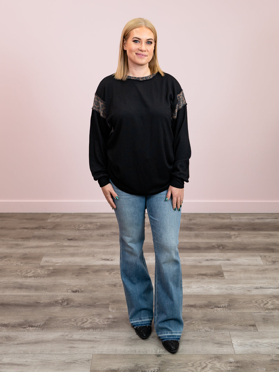 Prowl through your wardrobe in style with this sleek ribbed long sleeve top. Crafted from soft, touchable fabric, it features a classic crew neck and eye-catching leopard print accents along the neckline and shoulders—just enough wild to keep things interesting. The long sleeves offer versatile layering for any season. Perfect for casual outings or dressing up with your favourite accessories.
