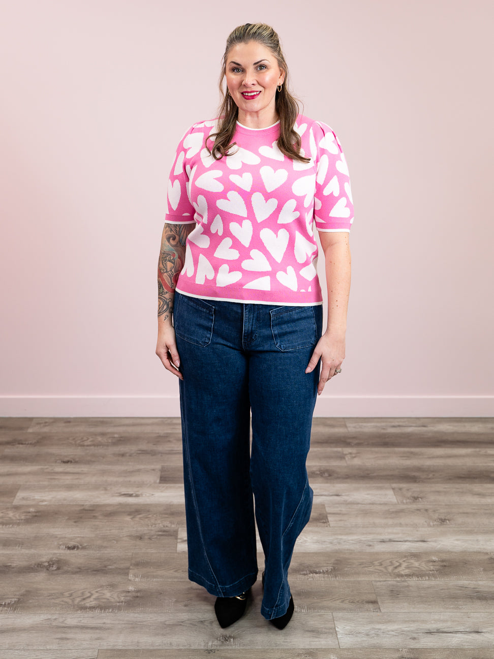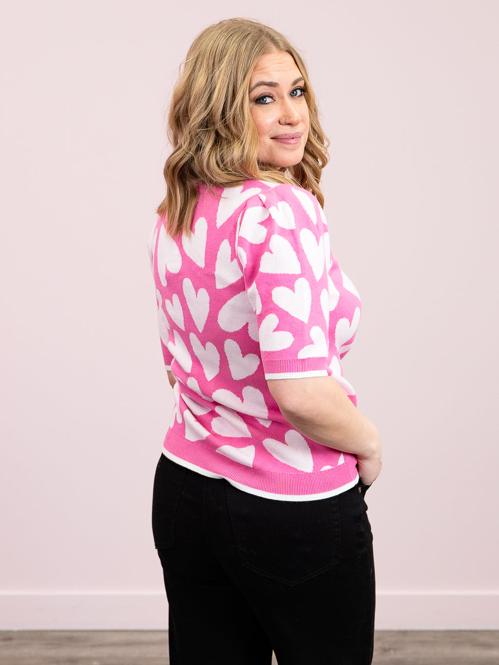Spread the love with this charming sweater featuring an all-over heart pattern that's impossible to resist. The soft, stretchy fabric moves with you, while ribbed details at the neckline, cuffs, and hem keep everything perfectly in place. Pleated shoulders add a playful touch of dimension and drama to your everyday look. Perfect for expressing your sweetest style.